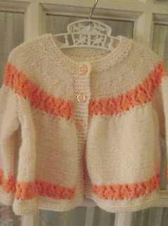 Besides working on the new life size baby doll, I finished a great throw and finally got around to taking pictures of the sweet vintage baby sweater I finished and blocked a couple weeks ago.